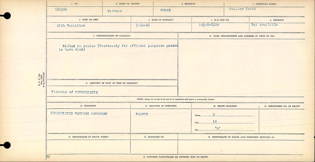 Courcelette is a village some 10 kilometres north-east of the town of Albert, just off the D929 road to Bapaume. The Courcelette British Cemetery is approximately 1 kilometre west of the village on the south side of a track, suitable for cars, from the secondary road from Courcelette to Pozieres. The route is signposted in the village.
