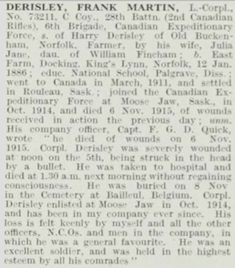Son of Julia J. Derisley, of Old Buckenham, Attleborough, Norfolk, England.