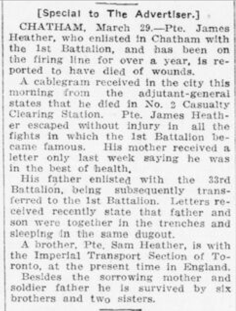 Son of Private Samuel Heather, who died during service with the Canadian Infantry (Western Ontario Regiment).