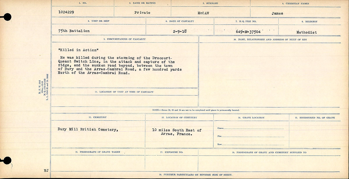 Dury is a village in the Department of the Pas-de-Calais, 1 kilometre north of the straight main road from Arras to Cambrai (D939). Approximately 16 kilometres from Arras travelling towards Cambrai on the D939 is the Canadian Forces Memorial at Dury. 300 metres after the Memorial the Cemetery is signposted to the left towards Dury village. 200 metres from the D939 the cemetery is signposted to the left. It is located in open fields, and is approached along an unsurfaced track about 500 metres long.