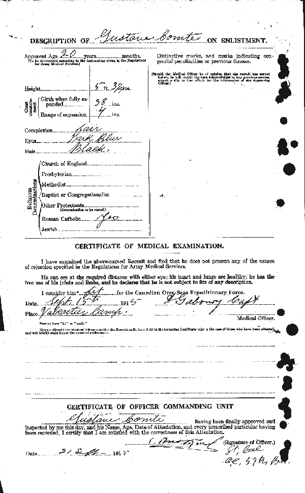 Enlisted in the 57th Battalion of the Canadian Expeditionary Force, he embarked with that unit for Great Britain, arriving in Liverpool on 8 June 1916. Assigned to the 69th Reserve Battalion, he was transferred to the 22nd Battalion on 27 August. Disembarking in France on the 28th, he took part in the Battle of Courcelette. From 6 April 1917 to 8 May 1917, he was illegally absent from duty and considered a deserter. Arrested on the 8th, he was court-martialed on 6 June 1917 and sentenced to death. He was shot on 3 July 1917 at Souchez, Pas-de-Calais.