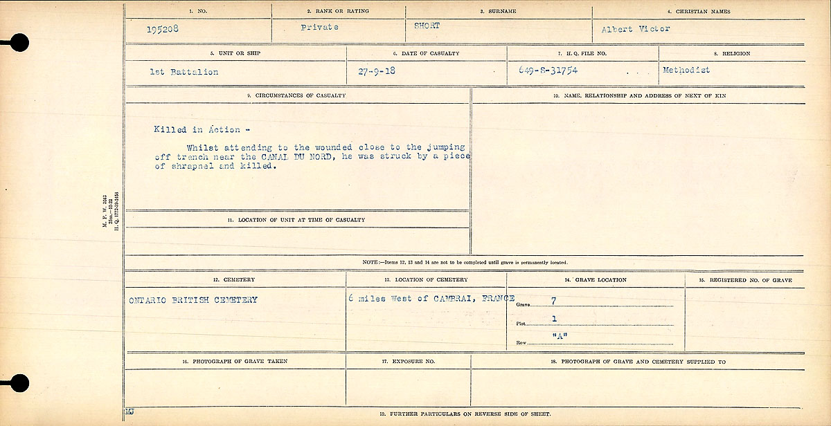 Sains-les-Marquion is a village and it lies approximately 2 kilometres south of Marquion, which lies on the main straight road from Arras to Cambrai. The Ontario Cemetery lies to the south of the village. The cemetery was made after the capture of Sains-les-Marquion by the Canadian Division on September 27, 1918. The Cemetery was enlarged after the Armistice and now covers an area of 949 square metres. It is enclosed by a rubble wall.