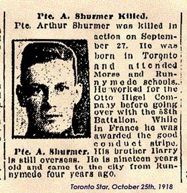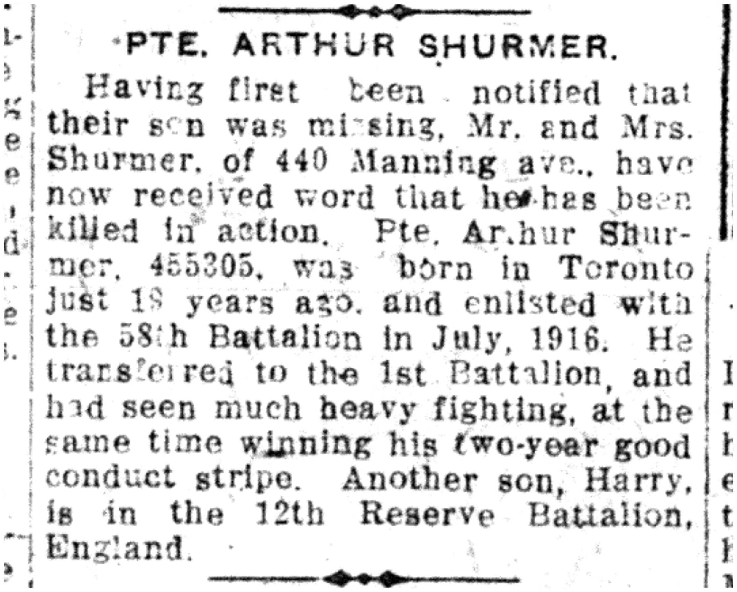 Son of William and Clara Shurmer, of 17, Jerome St., Toronto.
