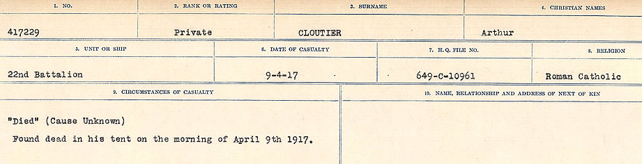 Enlisted in the 57th Battalion of the Canadian Expeditionary Force, he was transferred to the 41st Battalion and sailed for England, arriving in Plymouth on 28 October 1915. Transferred again to the 23rd Battalion on 29 February 1916, he left for France on 16 April to join the 22nd Battalion, to which he was posted on the 15th, and went to the front line on 6 May 1916.
