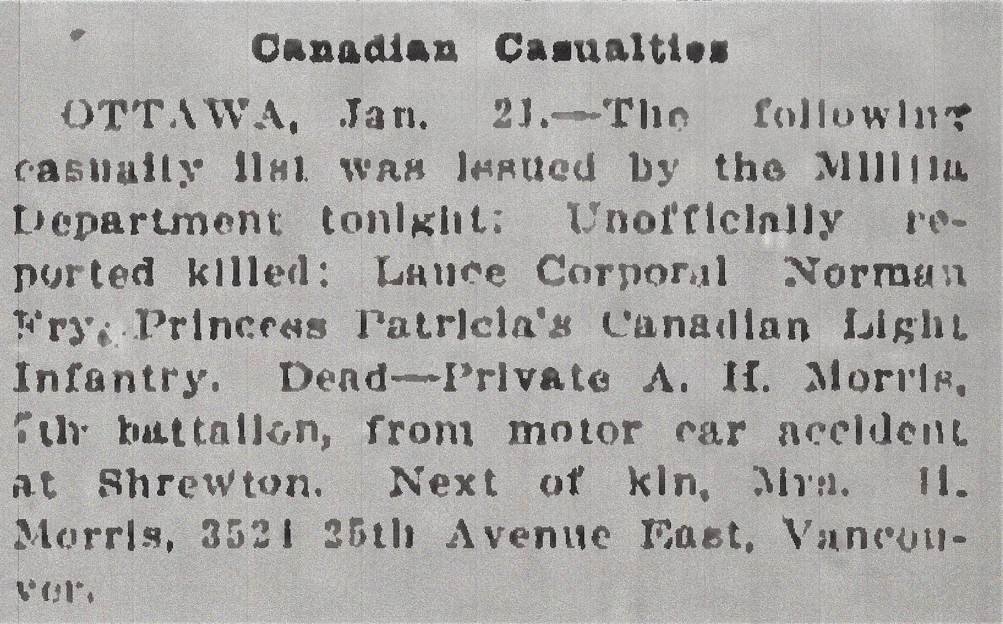 Youngest son of Mr. Francis S. Morris. Husband of Mrs. Henry Morris, Vancouver, British Columbia. Pte Morris served 13 years with the Light Shropshire Regiment. He was employed as a labourer. Death reported in Edmonton Bulletin on 28 January 1915.