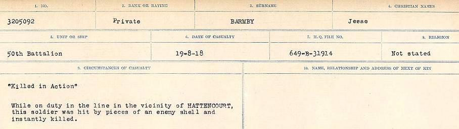 Son of Thomas Barmby, of Thwing, Hunmanby, Yorkshire, England. He was single and employed as a labourer. Soldier Barmby was the youngest of four sons who had emigrated from Yorkshire, England at the turn of the century. He lived in the Lang district of southern Saskatchewan and was most likely a farm worker. He suffered from asthma and when drafted in 1918, he didn't think he would pass the medical exam. On that day, his respiratory tract was clear and he was accepted. He was posted to Calgary's 50th King's Own Regiment. He fought and was killed during the battle of Amiens, less than a month after arriving in France.