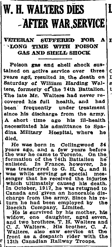 Son of Isable Walters, of 488, Clinton St. Toronto, Ont., husband of Selma G. F. Walters, of 738, Dupont St., Toronto, Ont.