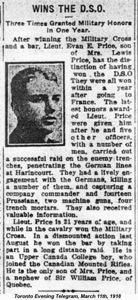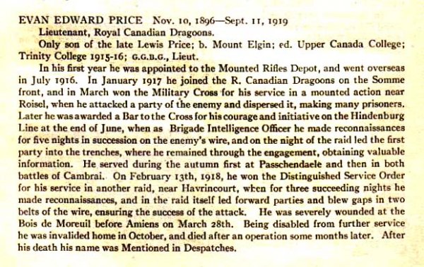 Son of Annie C. Price, of 19, Parkwood Avenue, Toronto, Ont., and the late Lewis A. Price. Lieutenant Price was wounded at Moreuil Wood on 30 March 1918, invalided home and died on September 11, 1919.