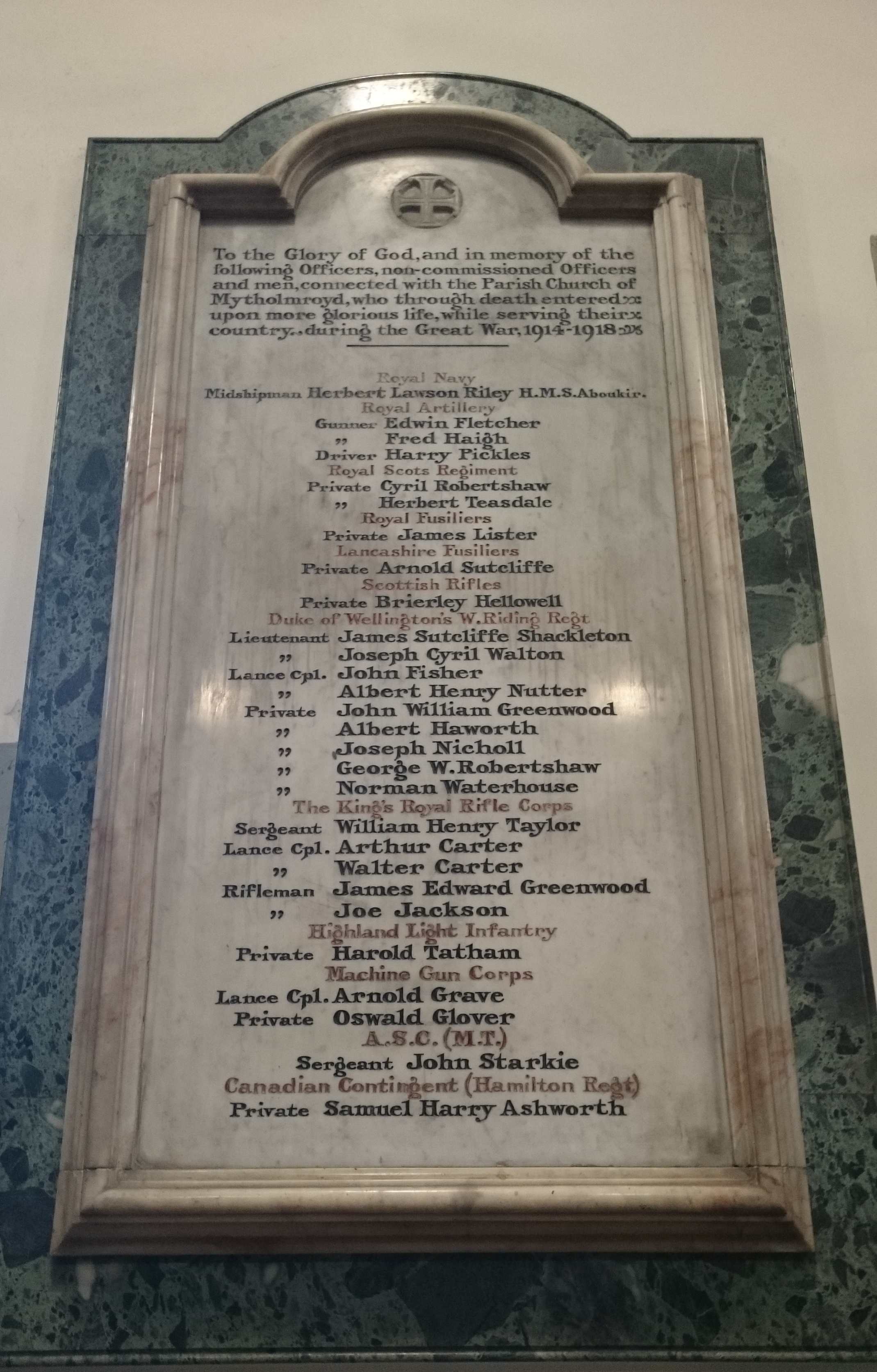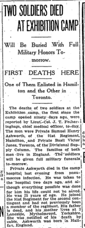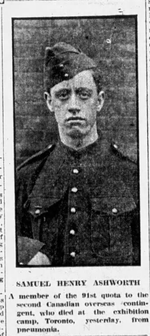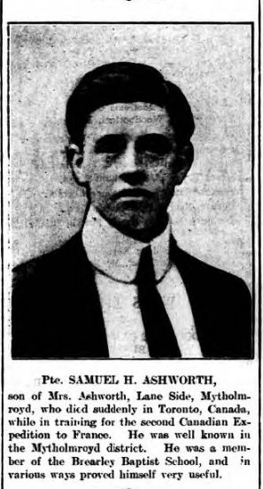 Son of Mrs. Alice Healey Ashworth, of 2, Langside, Mytholmroyd, Yorks, England.