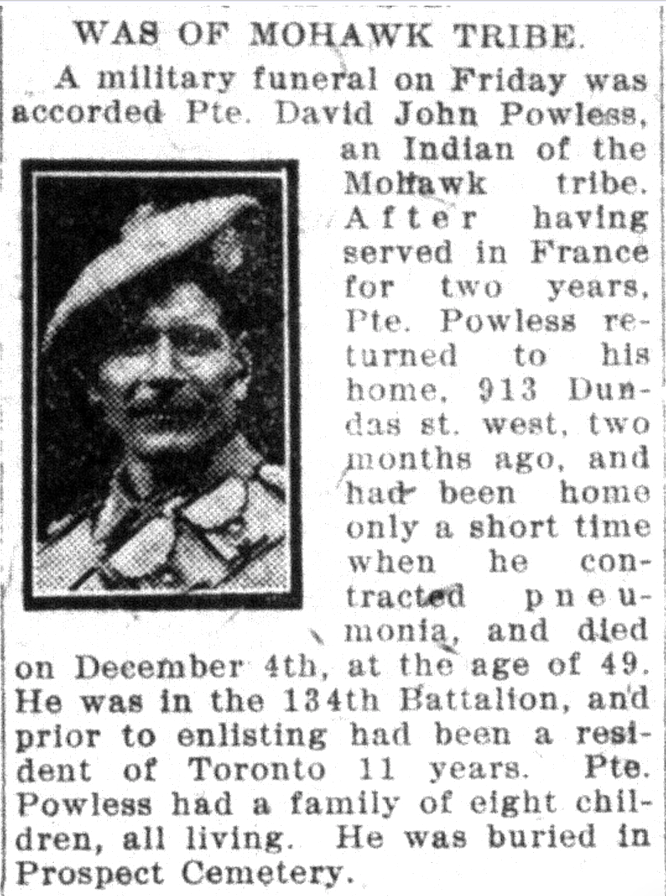 Son of Nancy Powless, of Deseronto, Ont., and the late Jacob Powless; husband of Rose Hannah Powless, of G/3, Dundas St., Toronto, Ont.