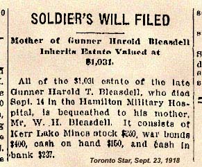 Son of Agnes Bleasdell, of 35, Farnham Avenue, Toronto, Ont., and the late William Henry Bleasdell.