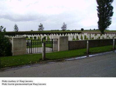 2.3 Km along the Komenseweg lies the right hand turning onto Vaartstraat. The SPOILBANK CEMETERY is located 1.6 Km along the Vaartstraat on the right hand side of the road.