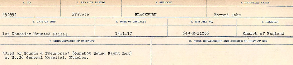 Husband of F. Wilkinson, of 103, 12th Avenue East, New Westminster, British Columbia.
