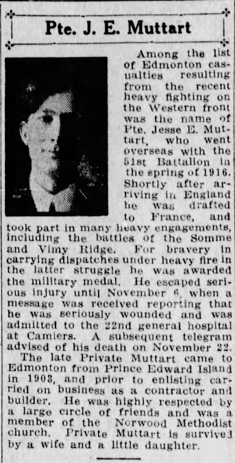 Son of George Muttart, of Prince Edward Island. Husband of Emily Muttart, of 110-12, 95th Street, Edmonton, Alberta.