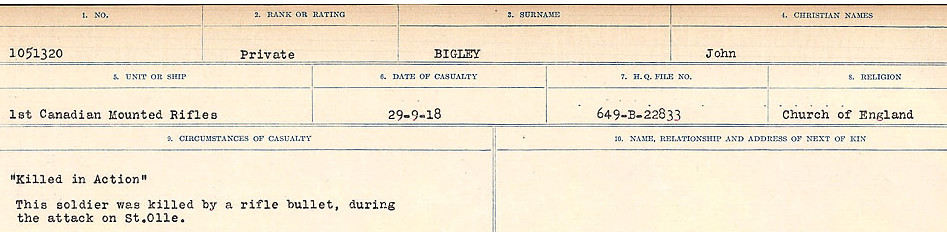 Son of John and Mary A. Bigley, of 41, Lonsdale St., Hull, England.