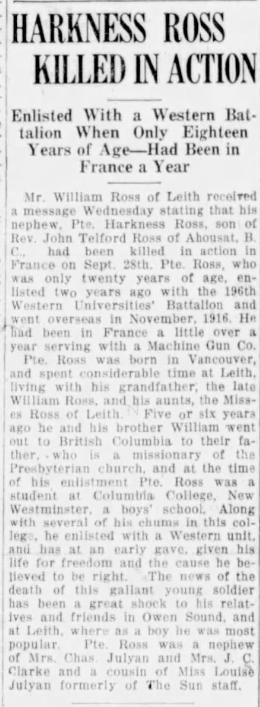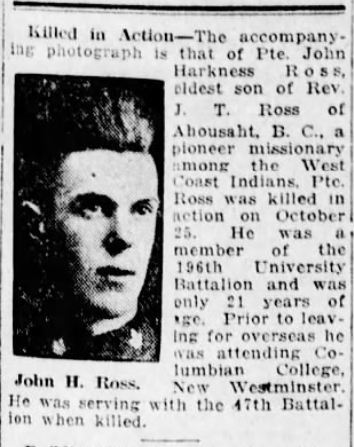 Son of John Telford Ross, of Edwin, Manitoba, and the late Frances Elizabeth Harkness Ross.
