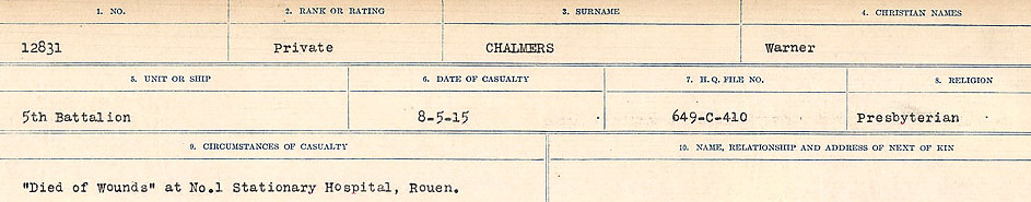 Son of Robert and Margaret Chalmers, of 22, Kyl St., Ayr, Scotland.