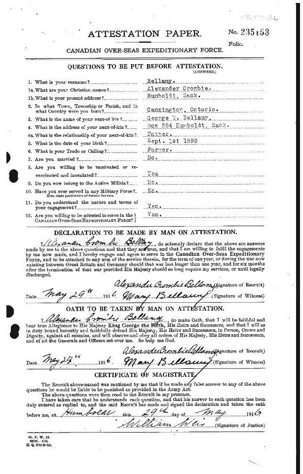 Son of George Wallace Bellamy and Mary Bellamy, of Mancroft, Saskatchewan.