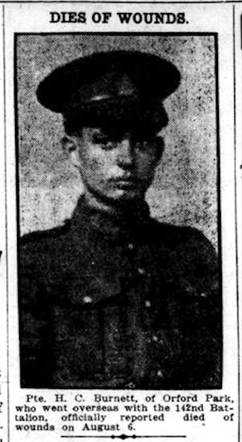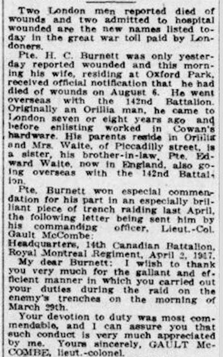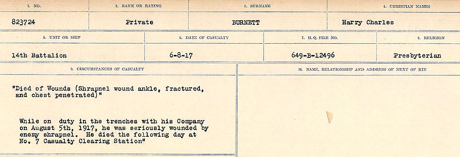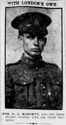 Son of William and Mary Ann (née Fox) Burnett. Husband of Myrtle Burnett of London, Ontario. He is commemorated on the family gravemarker with his parents at Hamlet Cemetery near Sparrow Lake, Ontario.