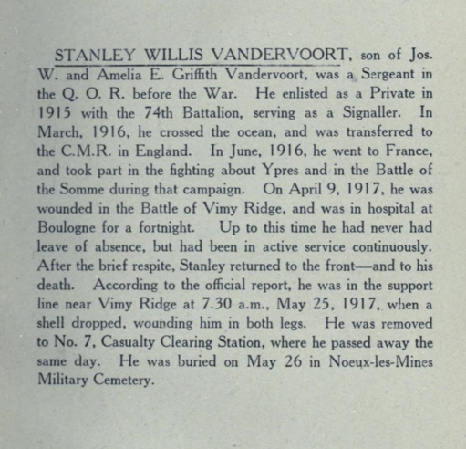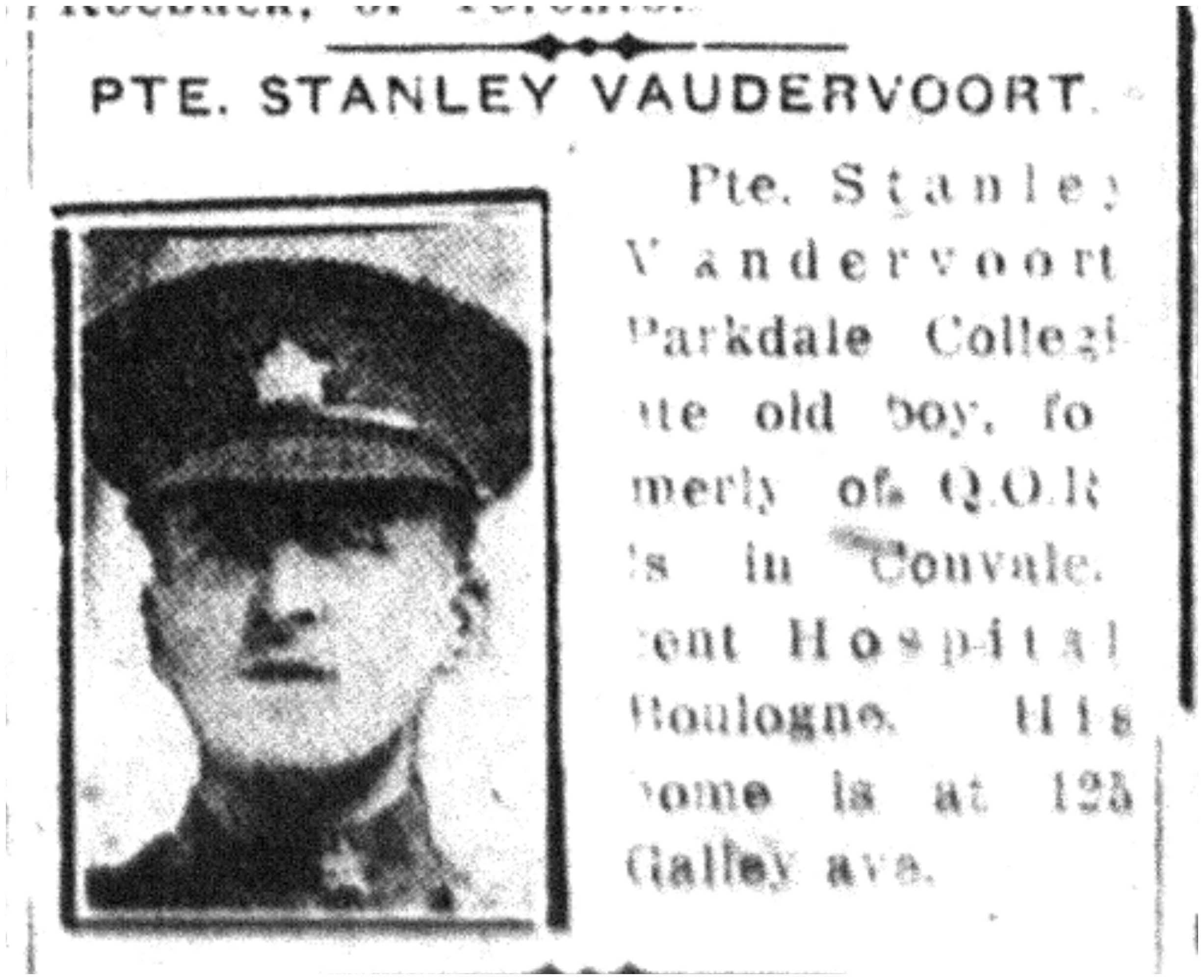 Only son of Joseph Willis Vandervoort and Amelia Edna Vandervoort, of 125, Galley Avenue, Toronto, Ontario. He listed his civilian occupation as clerk and was single.