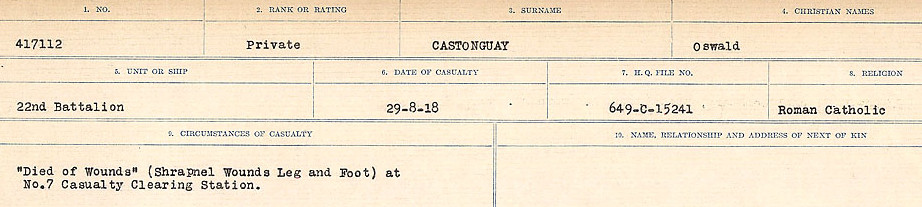 Born Henry-Oswald Castonguay. Son of John Henri Castonguay and Adèle Robichaud, of Greenville, New Hampshire. He stated being born in 1895 when he enlisted.