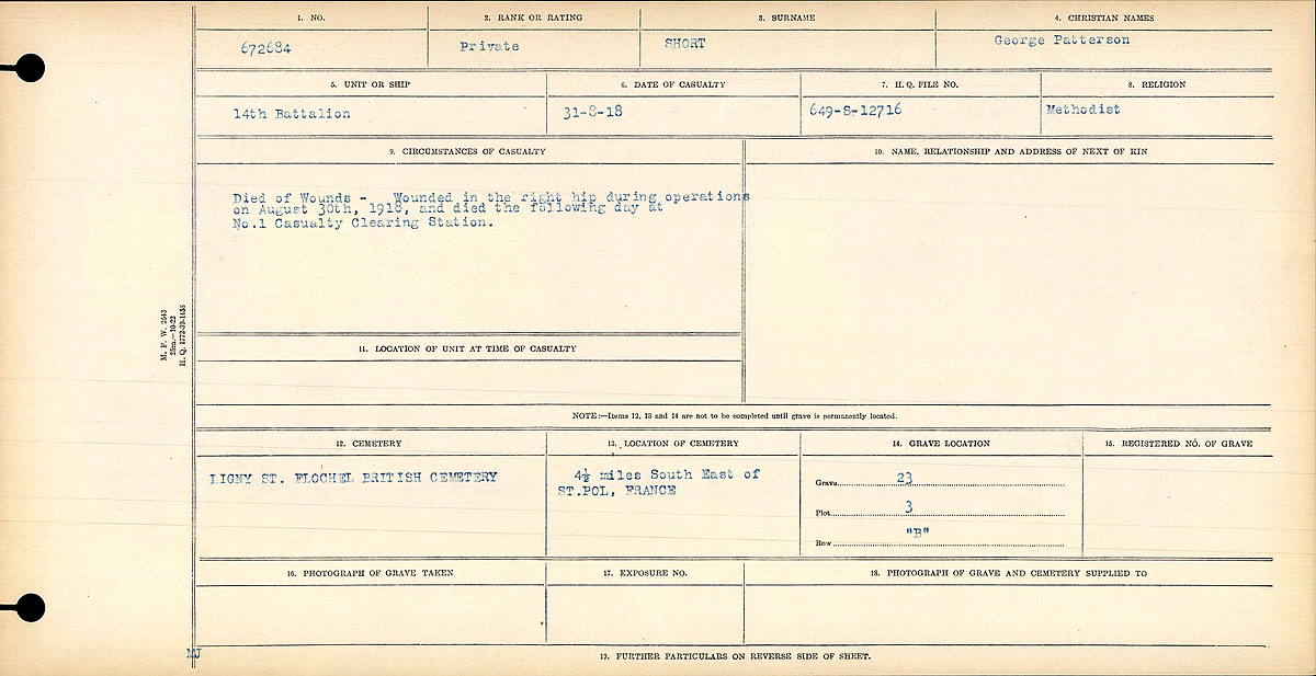 Son of Wm. Short, of 83, Station St., Shawinigan Falls, P.Q., Canada.