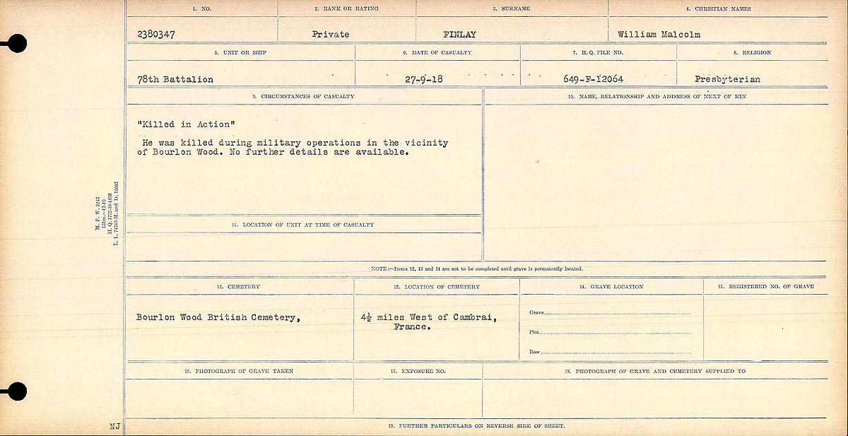 Bourlon is a village approximately 6 kilometres west of Cambrai. It lies between the main Cambrai to Bapaume road (N30) and the Cambrai to Arras road (D939). The BOURLON WOOD CEMETERY is signposted from the centre of the village as is the Canadian Forces Memorial. On approaching the Memorial the road should be followed to the left where an unsurfaced track descends about 200 metres to the cemetery.