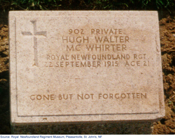 Son of Hugh Henry and Lottie McWhirter, of Humbermouth, Bay of Islands, Newfoundland. Pte McWhirter was the first member of The Royal Newfoundland Regiment to be killed in the First World War.