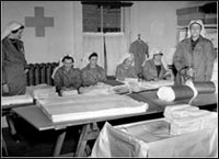 There was a trained, uniformed Canadian Red Cross Corps, as well as junior clubs for youth. Just as in the First World War, they sent medical aid overseas. They also sent home comforts – food, warm clothing, quilts made at quilting parties, sweets, cigarettes and books. These packages were especially appreciated by those held in prisoner-of-war camps.