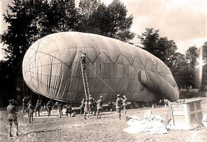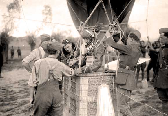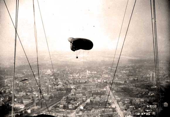 Observation balloons were filled with hydrogen and were attached to a machine to pull them down quickly if threatened by an enemy airplane. The observer in the basket of the balloon had a wireless radio transmitter, binoculars and a long-range camera. His job was to report enemy activity.