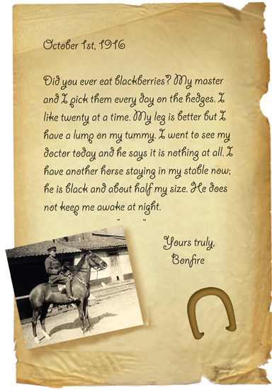 My ancestor was a wonderful horse named Bonfire. He was given as a gift to Dr. John McCrae. There were no jeeps to carry doctors and nurses to the wounded in the First World War. There were no helicopters to drop a doctor into a war zone. Bonfire would get the doctor where he had to be.