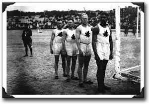Canadian team after winning second place in 4 x 200 m relay at Inter-Allied Games in 1919.