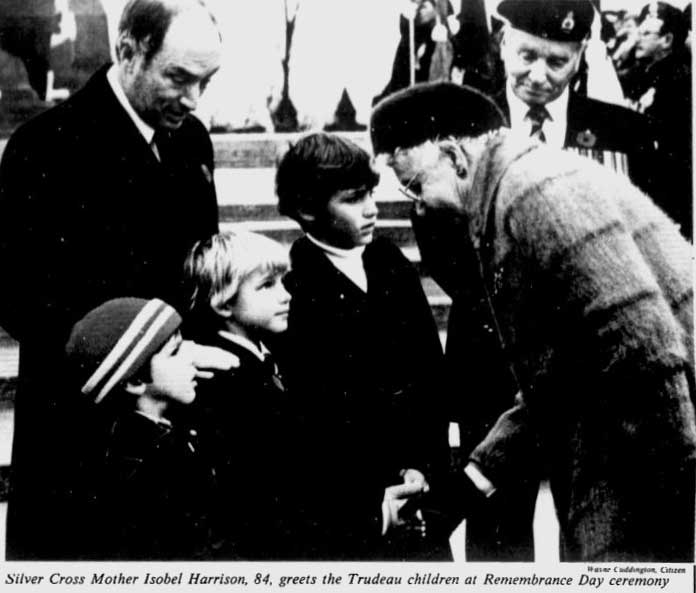Mrs. Isabel Harrison from Bury, Quebec, was chosen 1981 National Memorial (Silver) Cross Mother. During the national Remembrance Day ceremony in Ottawa on November 11, 1981, she laid a wreath at the base of the National War Memorial on behalf of all mothers who have lost a child in military service to Canada.