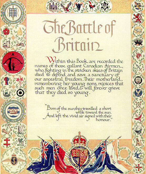 Within this Book are recorded the names of those gallant Canadian Airmen, who, fighting in the stricken skies of Britain died to defend and save a sanctuary of our ancestral freedom. Their motherland, remembering her young sons, rejoices that such men once lived, & will forever grieve that they died so young.