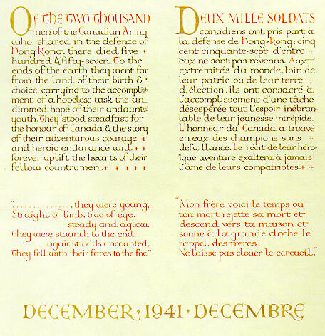 Of the two thousand men of the Canadian Army who shared in the defence of Hong Kong, there died five hundred & fifty-seven. To the ends of the earth they went; far from the land of their birth & choice, carrying to the accomplishment of a hopeless task the undimmed hope of their undaunted youth. They stood steadfast for the honour of Canada & the story of their adventurous courage and heroic endurance will forever uplift the hearts of their fellow countrymen.