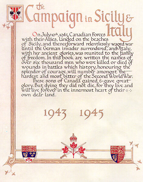 On July 10th, 1943, Canadian Forces with their Allies, landed on the beaches of Sicily, and thenceforward relentlessly waged war until the German invader surrendered, and Italy, with her ancient glories, was reunited to the family of freedom. In this book are written the names of over six thousand men who were killed or died of wounds in battles which history, honouring the splendor of courage, will number amongst the hardest and most bitter of the Second World War