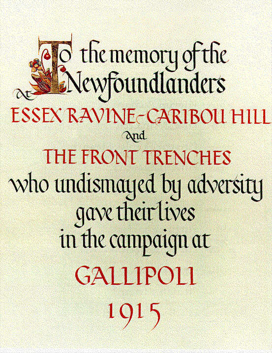 To the memory of the Newfoundlanders at Essex Ravine - Caribou Hill and The Front Trenches who undismayed by adversity gave their lives in the campaign at Gallipoli 1915