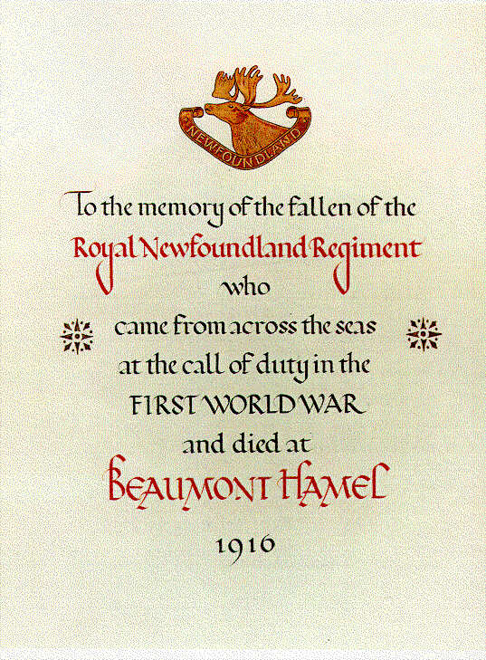 To the memory of the fallen of the Royal Newfoundland Regiment who came from across the seas at the call of duty in the First World War and died at Beaumont Hamel