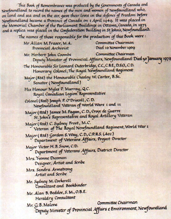 This Book of Remembrance was produced by the Governments of Canada and Newfoundland to record the names of the men and women of Newfoundland who, on land and sea and in the air, gave their lives in the defence of Freedom before Newfoundland became a Province of Canada on 1 April 1949. It was placed in the Memorial Chamber of the Parliament Buildings in Ottawa, Canada, in 1973 and a replica was placed in the Confederation Building in St. John's, Newfoundland.
