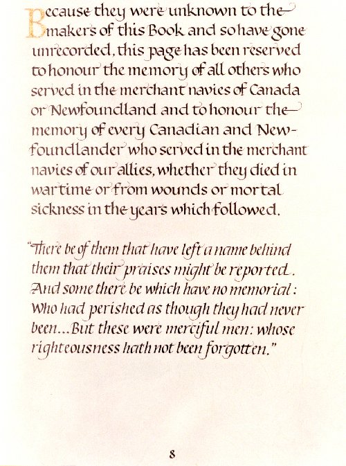 Because they were unknown to the makers of this Book and so have gone unrecorded, this page has been reserved to honour the memory of all others who served in the merchant navies of Canada or Newfoundland and to honour the memory of every Canadian and Newfoundlander who served in the merchant naview of our allies, whether they died in wartime or from wounds or mortal sickness in the years which follows. "There be of them that have left a name behind them that their praises might be reported. And some there be which have no memorial: Who had perished as though they had never been... But there were merciful men: whose righteousness hath not been forgotten."