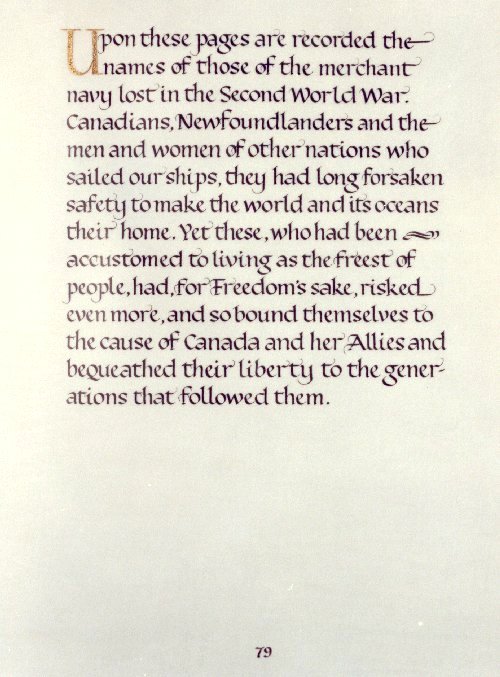 Upon these pages are recorded the names of those of the merchant navy lost in the Second World War. Canadians, Newfoundlanders and the men and women of other nations who sailed our ships, they had long forsaken safety to make the world and its oceans their home. Yet these, who had been accustomed to living as the freest of people, had, for Freedom's sake, risked even more, and so bound themselves to the cause of Canada and her Allies and bequeathed their liberty to the generations that followed them.