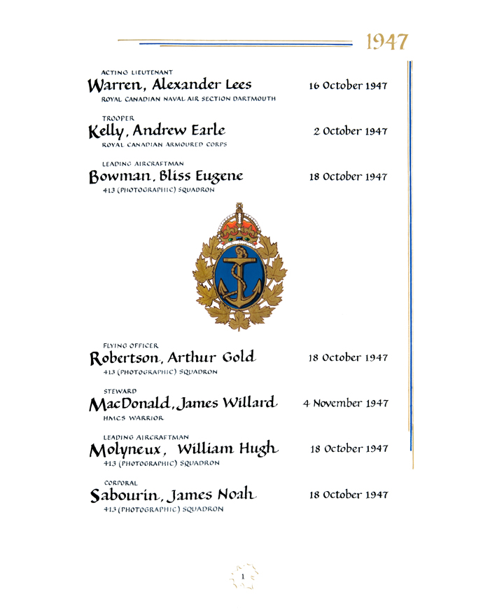 | 2622998 | Robertson | Arthur Gold | October 1, 1947 | Flying Officer | |