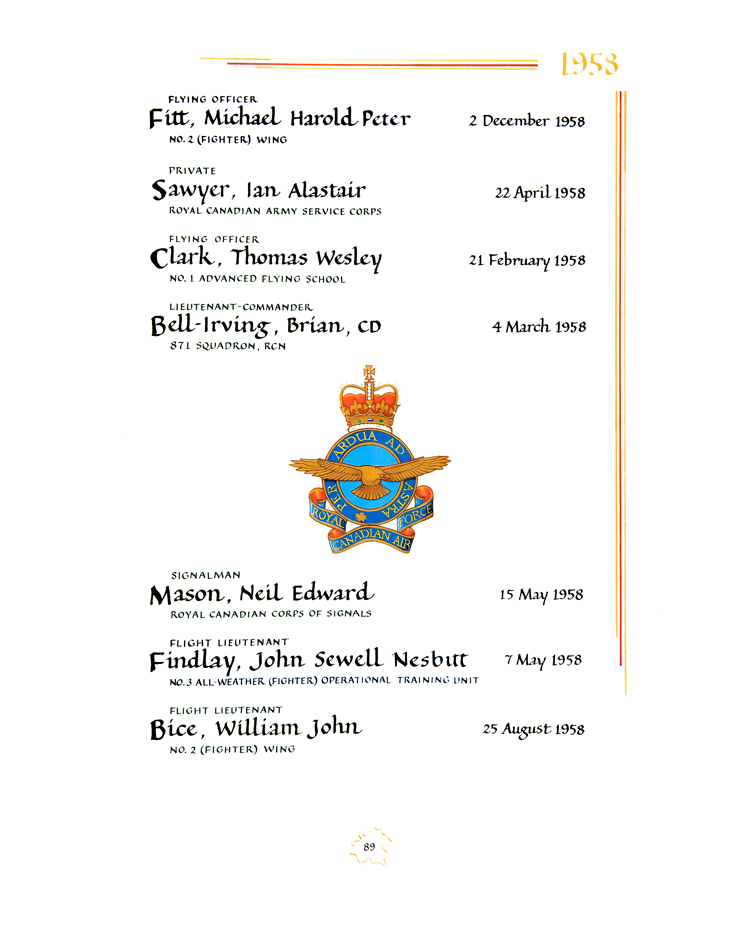 | 80001984 | Clark | Thomas Wesley | February 21, 1958 | Flying Officer | No. 1 Advanced Flying School |