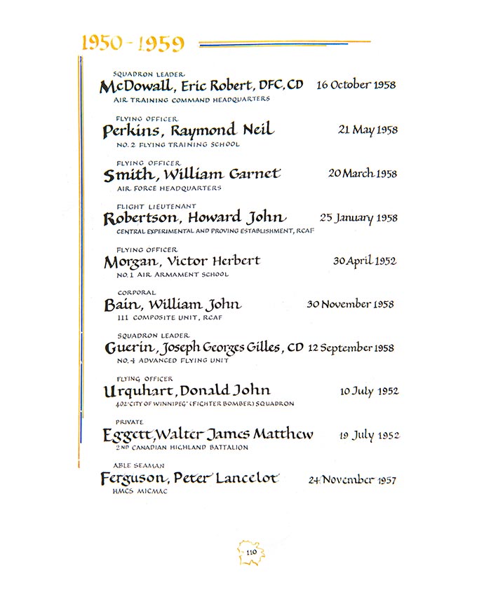 | 80003229 | Robertson | Howard John | January 25, 1958 | Flight Lieutenant | Central Experimental and Proving Establishment, RCAF |