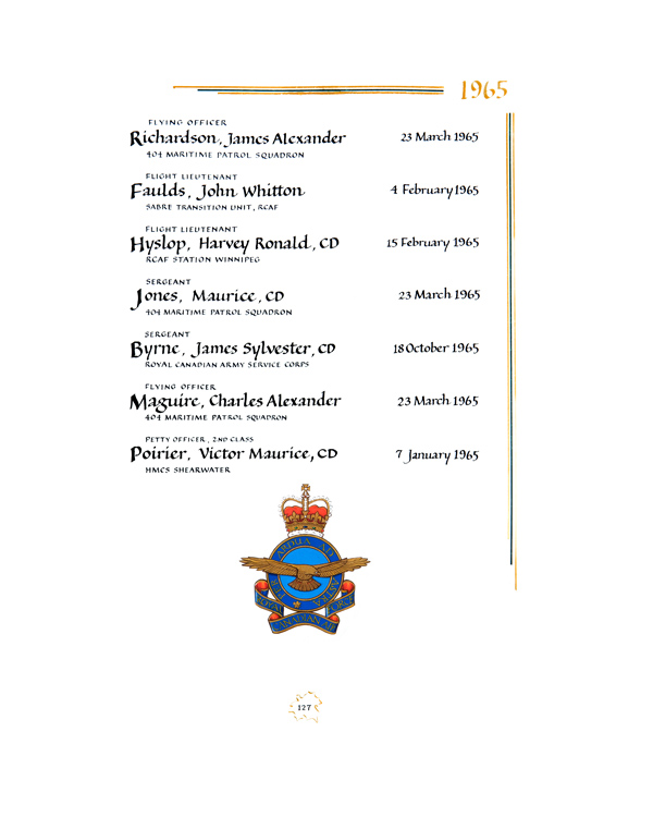 | 80002494 | Richardson | James Alexander | March 23, 1965 | Flying Officer | 404 Maritime Patrol Squadron |