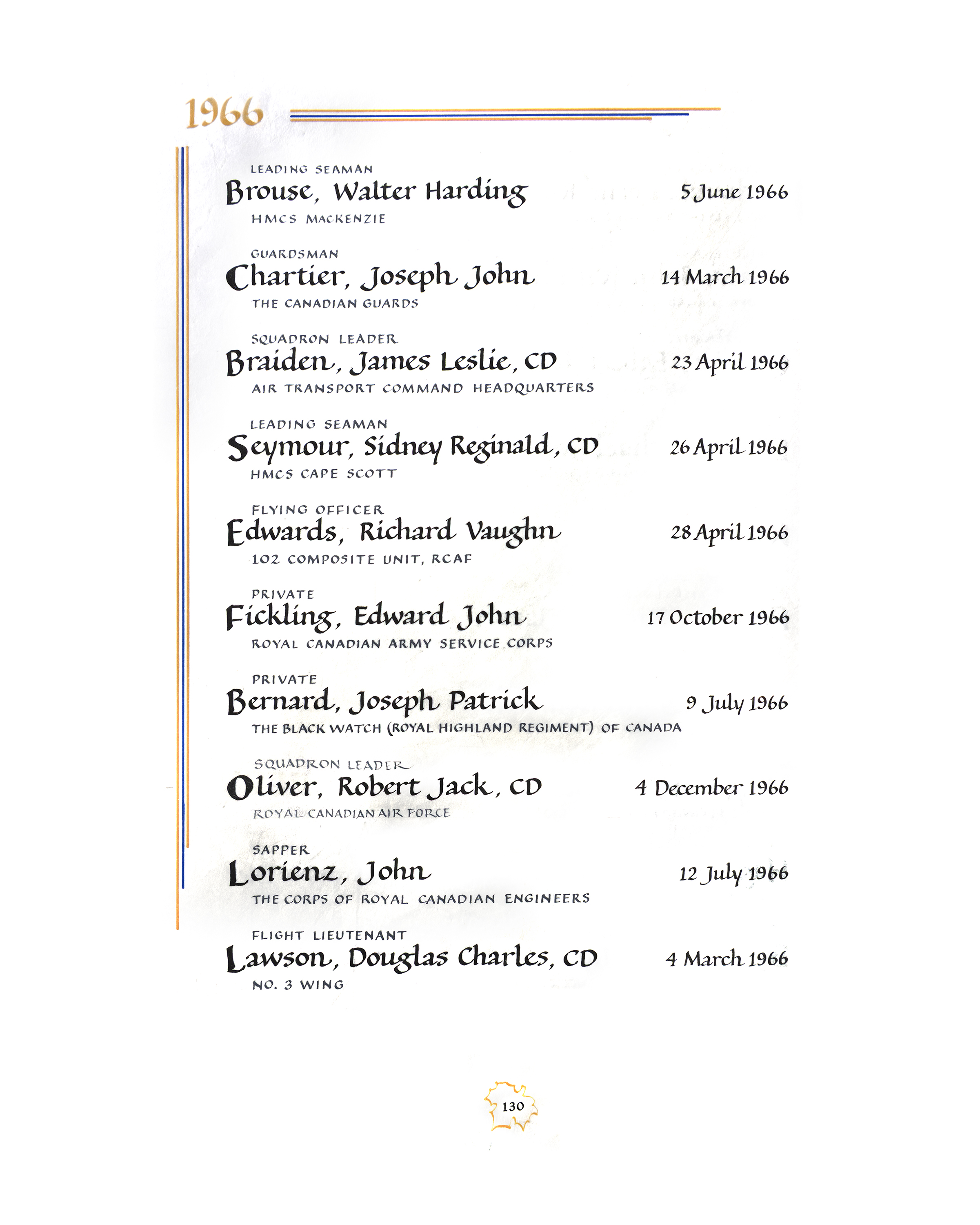| 80002425 | Oliver | Robert Jack | December 4, 1966 | Squadron Leader | Royal Canadian Air Force |
