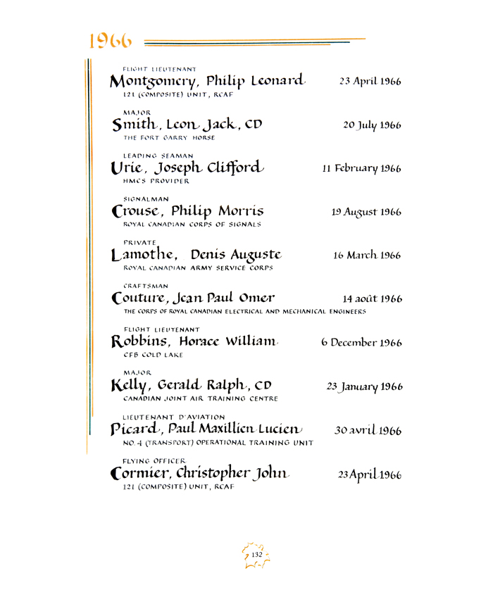 | 80002384 | Montgomery | Philip Leonard | April 23, 1966 | Flight Lieutenant | 121 (Composite) Unit, RCAF |