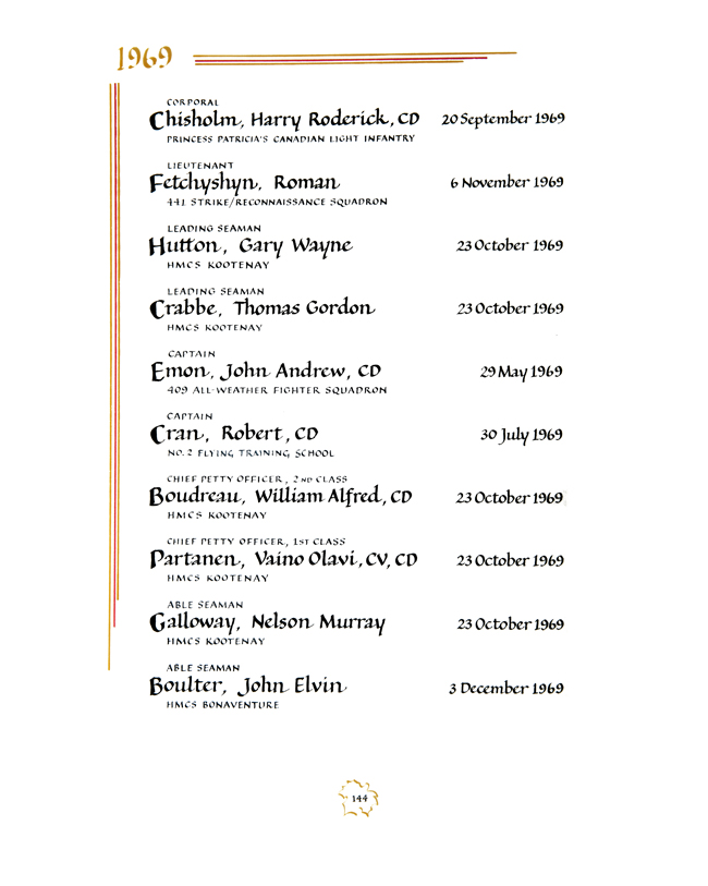 | 80001977 | Chisholm | Harry Roderick | September 20, 1969 | Corporal | Princess Patricia's Canadian Light Infantry |