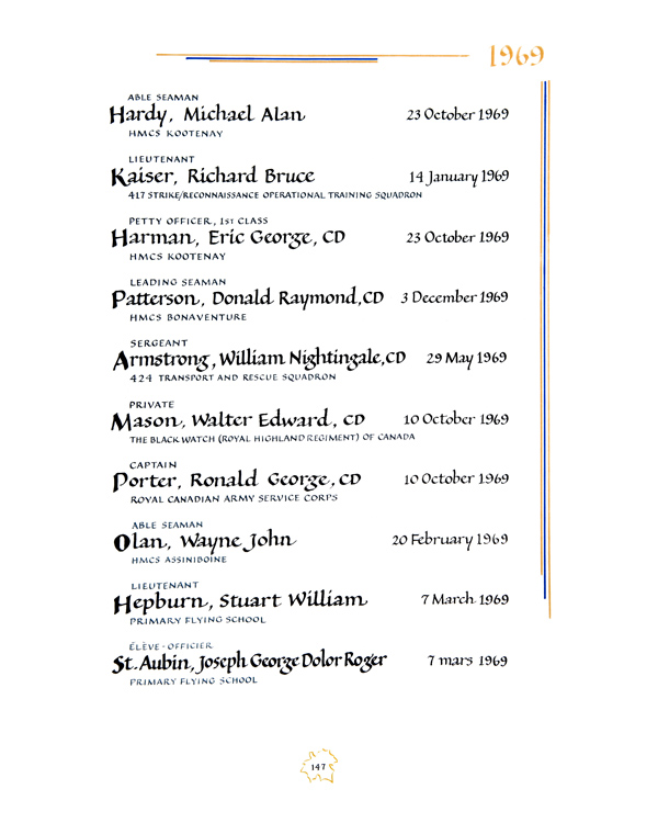 | 80002446 | Patterson | Donald Raymond | December 3, 1969 | Leading Seaman | HMCS Bonaventure |