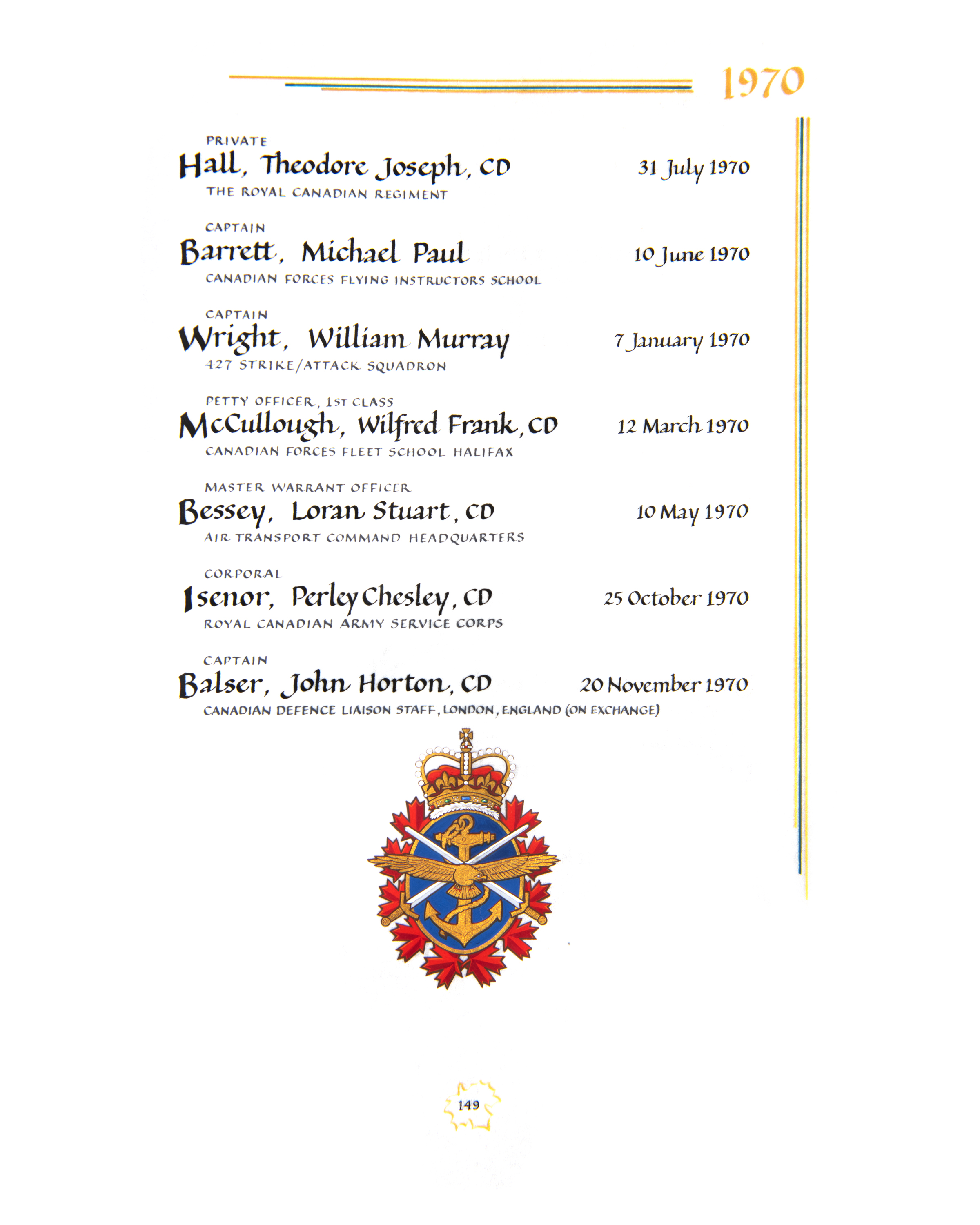 | 80001869 | Balser | John Horton | November 20, 1970 | Captain | Canadian Defence Liaison Staff, London, England (On Exchange) |